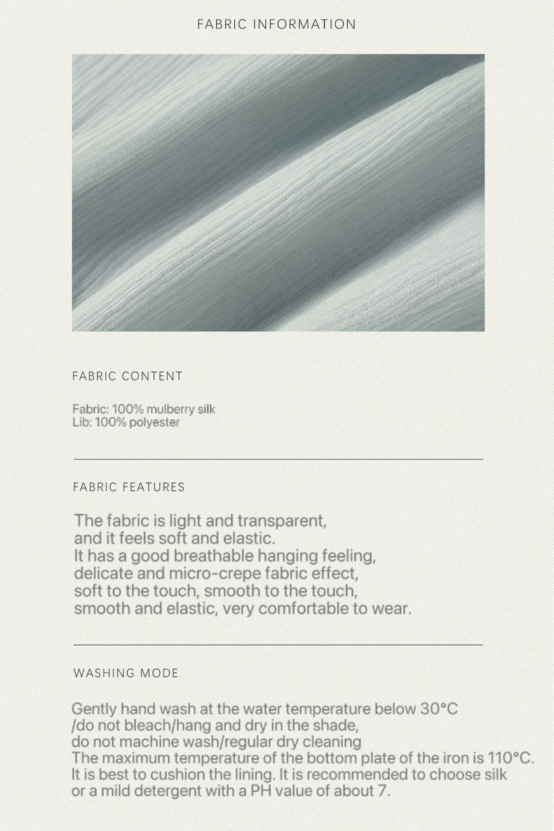 100% mulberry silk feels light and transparent, and the upper body is skin-friendly and soft.