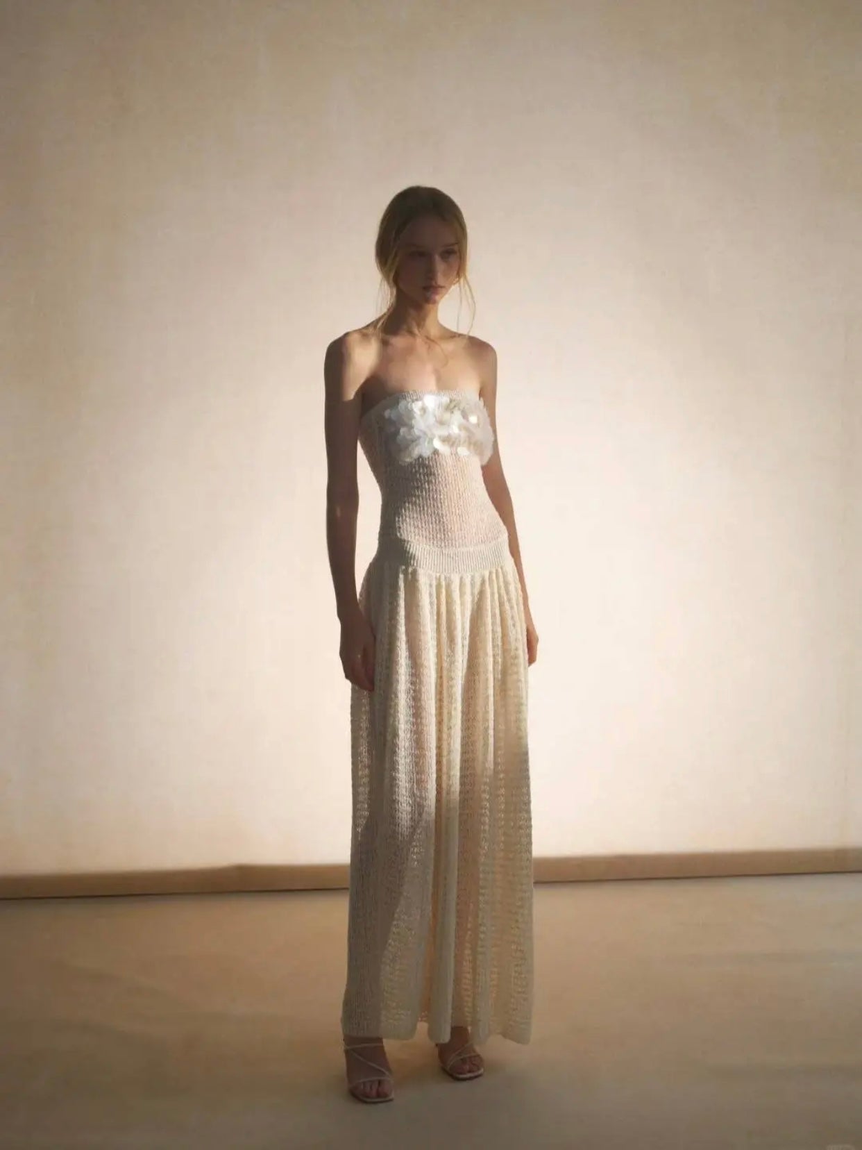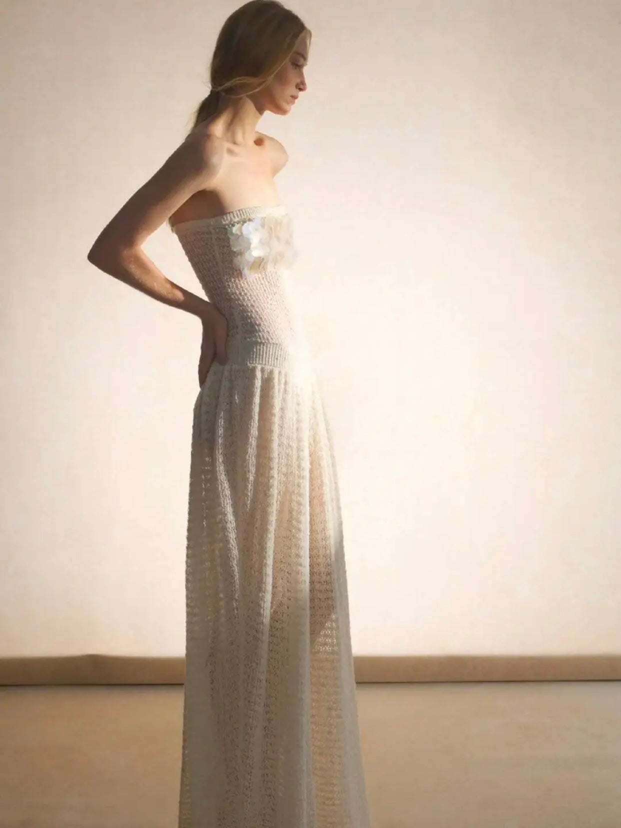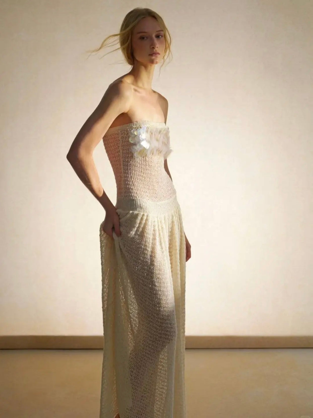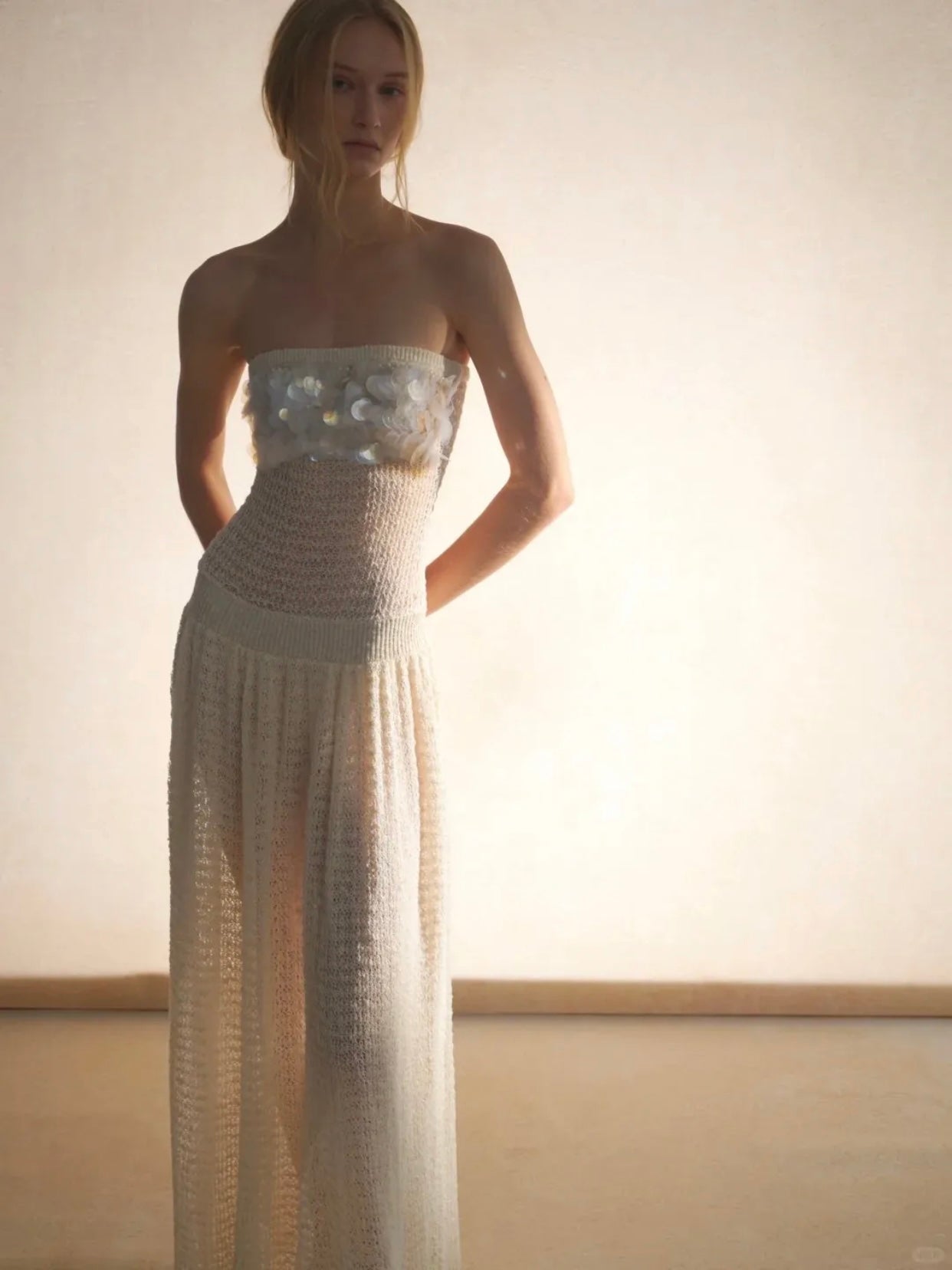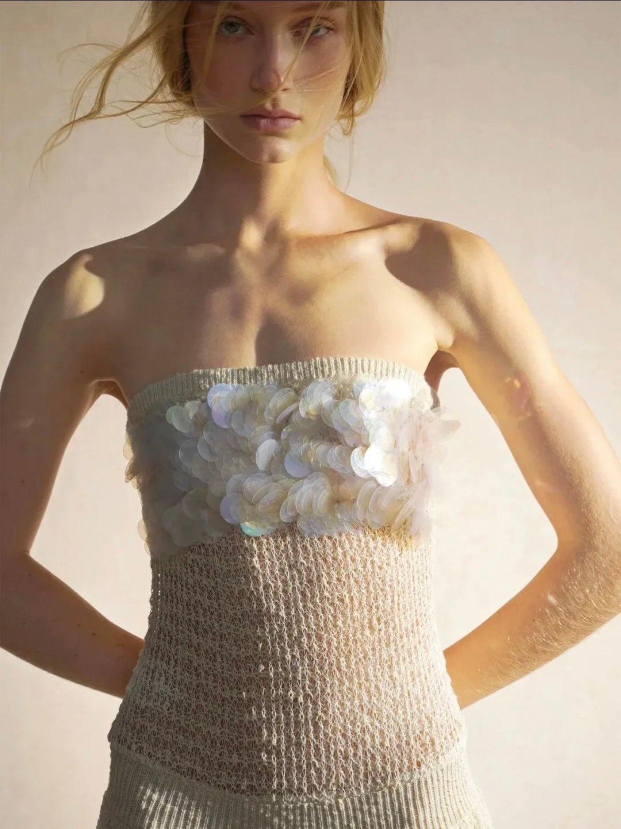 Indian Handmade High-Customization Sheer Sequin Pearl Hollow-Out Ruched Knitted Crop Top Dress