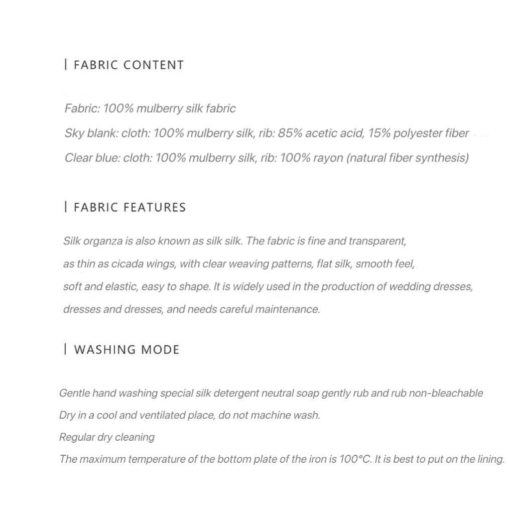 Silk organza is also known as silk silk. The fabric is fine and transparent, as thin as cicada wings, with clear texture, flat silk surface, smooth to the touch, soft and elastic, easy to shape.